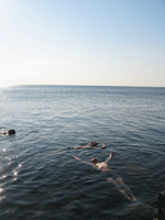 If you concentrated on it, you could be comfortable in the water. If you relaxed, tried to let your muscles go, you could stay warm. Bathers could hear the sounds clearly through bone conduction so long as their heads were at least partially submerged. Listeners experimented by sitting on rocks near the shore and dipping their heads underwater, by plunging underwater with snorkels, and by treading water far from shore. Most found very quickly that the only sustainable way to listen was to lie flat on their backs, floating, with their hands above their heads for balance. This way one got one’s head underwater, stayed as much as possible in the warm upper layer of the water, and got the sun’s warmth. Once you got the floating right you could nearly let go and simply listen – nearly. Each passing boat required some adjustment. |