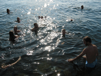 When we arrived at Västra Hamnen it was packed with tanned young bodies. Part of Västra Hamnen was developed as a swimming and sunbathing site by the city of Malmö in conjunction with an experimental housing development built as part of an exhibition in 2001 at the harbor. The homes in Västra Hamnen are some of the more costly places to live in Malmö. The people who live in them do not universally care for the crowds that have grown, year after year, at the concrete and wooden piers that constitute the public bathing site. The crowds are noisy and young. Young men on EU-mopeds modified for both velocity and auditory qualities speed about. Fights occasionally break out. Eventually the city installed speed bumps and other traffic calming measures, started to develop other areas of the harbor in an effort to lure the public away from the housing developments. The concrete bathing site, however desperate and grey when empty, remains popular. The majority have not been moved, either to the beach on one side or to the park on the other. Young men with giant diamond studs in their ears sit with boom boxes and wait for something nice in a bikini top. Groups of women tan together, turning over simultaneously. Everywhere you can hear chatter, laughing young women, and the sound of dozens of stereos, each playing something aggressive and American.